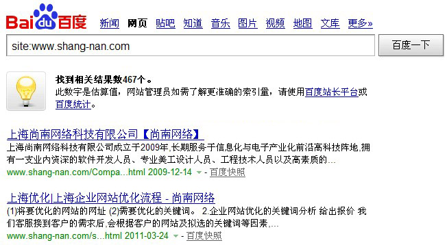 第一、首先通過site:指令來查詢網站收錄變化,比如說你的網址是www.bjhskq.com,就在百度里搜索“site:www.bjhskq.com”來查詢你的網站收錄情況,site指令查詢結果主要有以下幾種情況: