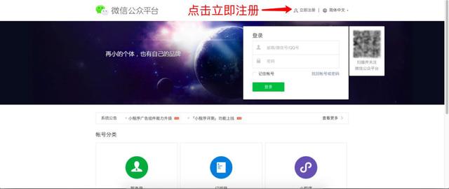 注冊(cè)操作路徑:打開微信公眾平臺(tái),點(diǎn)擊右上角立即注冊(cè)